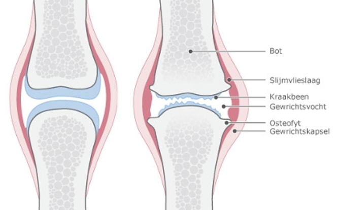 Op de linker afbeelding is een gezond gewricht te zien. Op het rechter plaatje een gewricht met artrose. Bij artrose worden de lagen kraakbeen dunner, zachter en brokkeliger.